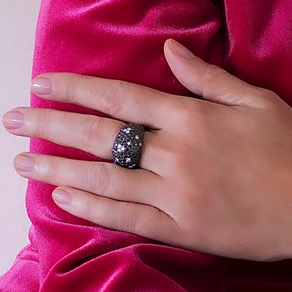 138 untreated black diamonds 3.60ct., brilliant cut 13 white diamonds 0.10ct., g/h vs, brilliant cut set in 18K white gold rhodium-plated, size 54, 19g