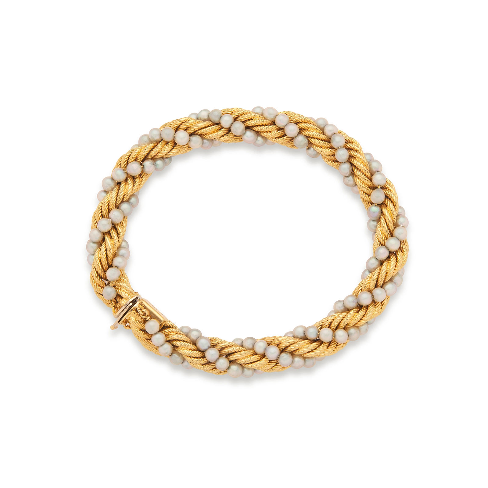 18K yellow gold, pastel toned grey cultured pearls inner circumference 16.5cm, width 1cm, 28.6g