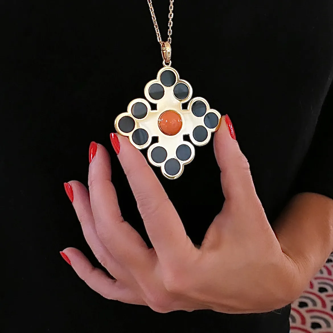 1 pink coral cabochon 12 blood jasper discs set in 18K yellow gold, 5.3x5.3cm, 67.5g signed Bvlgari, original bespoke case