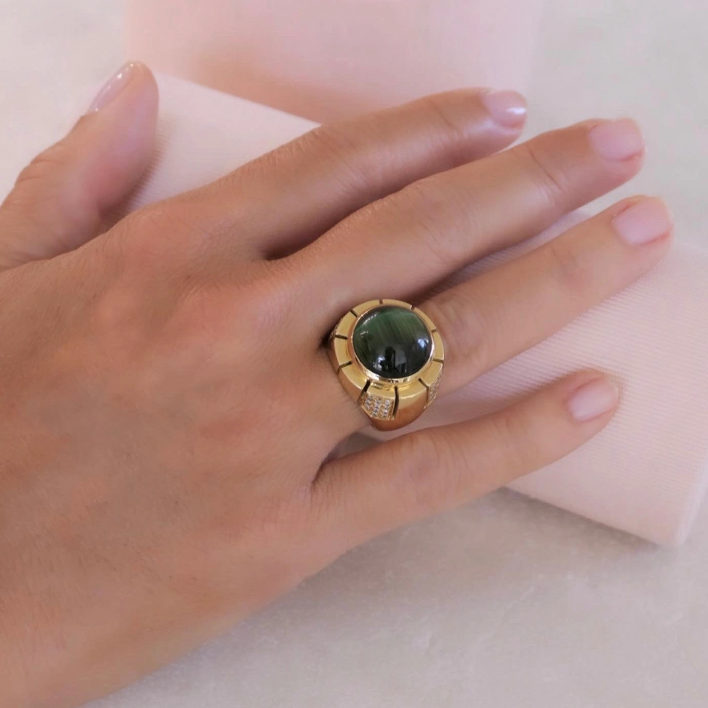 Tourmaline Cat's Eye (chatoyance effect), approx. 12.00 ct., Cabochon cut 44 diamonds approx. 0.44 ct., H si, brilliant cut set in 18K yellow gold, size 53, 23g
