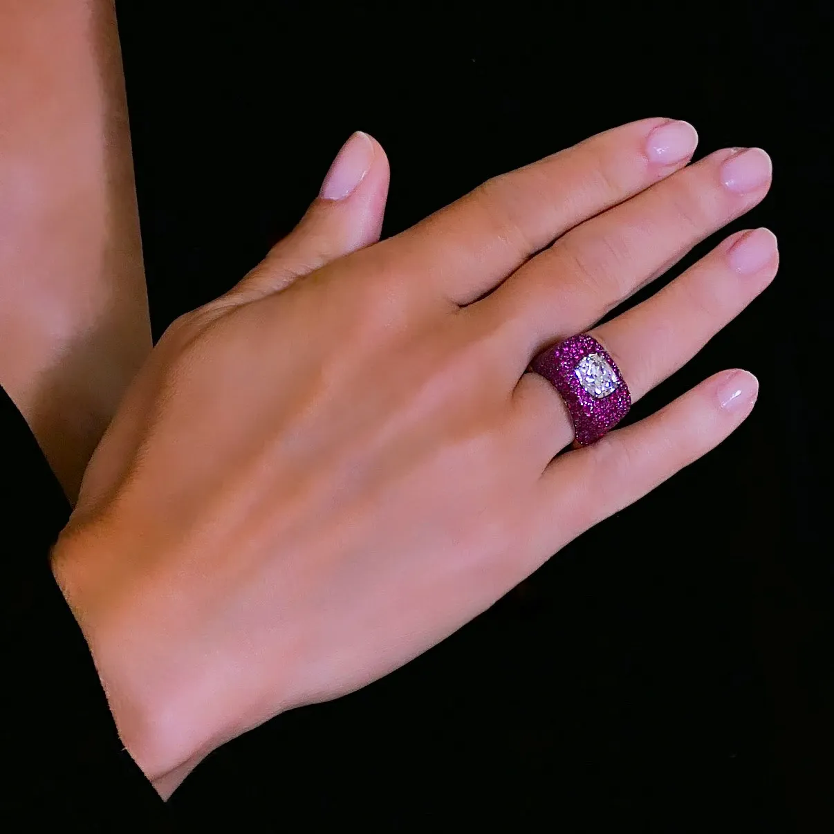 Antique diamond, 3.35 ct., J-Si2, cushion cut 204 rubies, 5.65 ct., faceted set in 18K rose gold size 53, 17.8g Certificate
