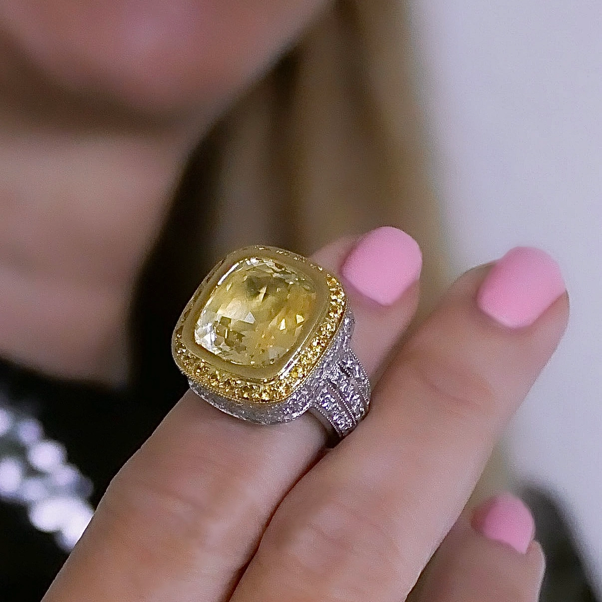 Yellow sapphire 10.80 ct., untreated, Sri Lanka 74 diamonds, approx. 2.20ct., E/F si, brilliant cut 25 yellow sapphires, ca. 1.20ct., brilliant cut set in 18K yellow and white gold, size 51, 22.7g Certificate