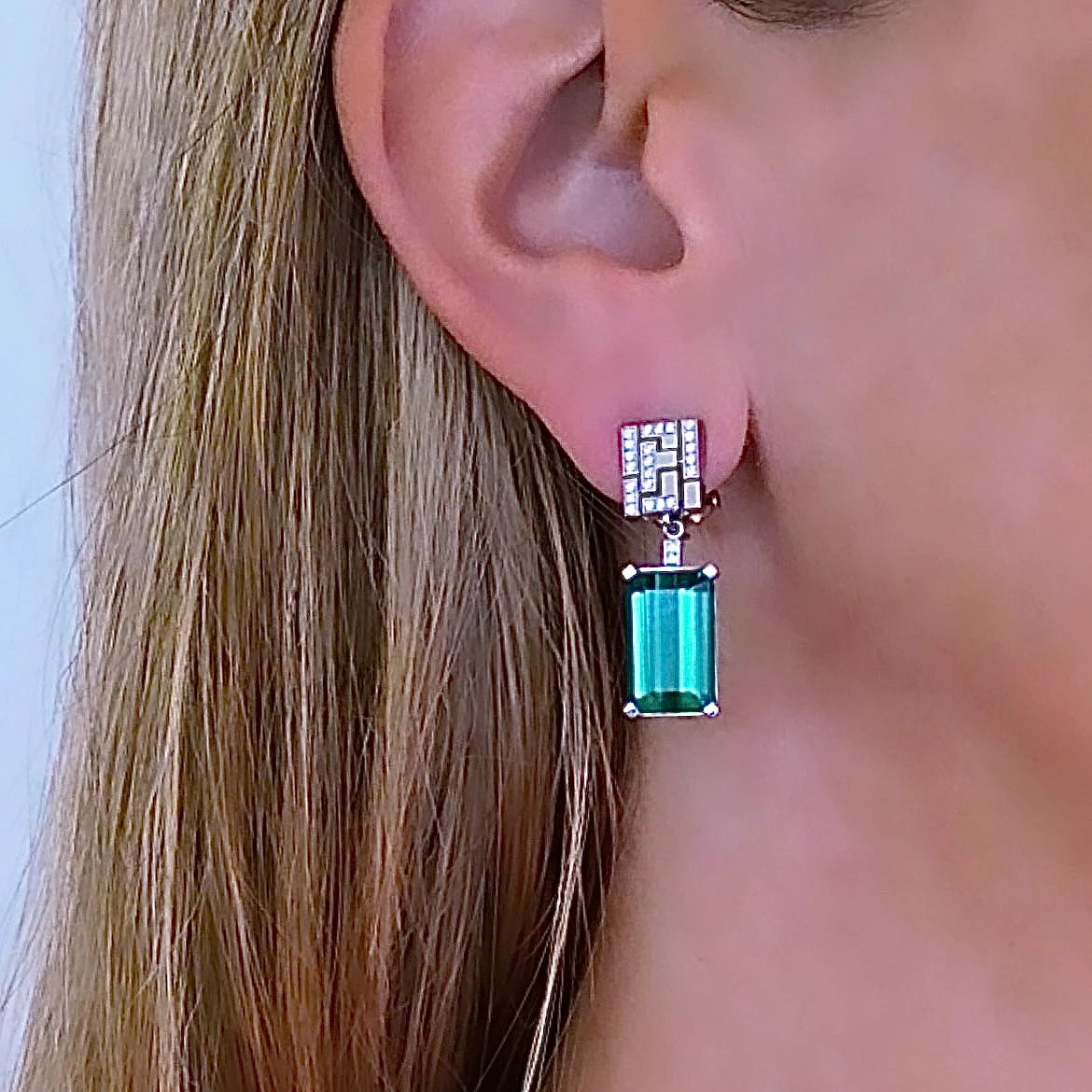 2 Turmaline grün 13.83 ct., 8-eckig facettiert, unbehandelt 48 Diamanten 0.22ct., F vvs, Brillantschliff gefasst in 18K Weissgold, Länge 2.5cm, 12.6g Turmalin Ohrhänger abnehmbar Zertifikat