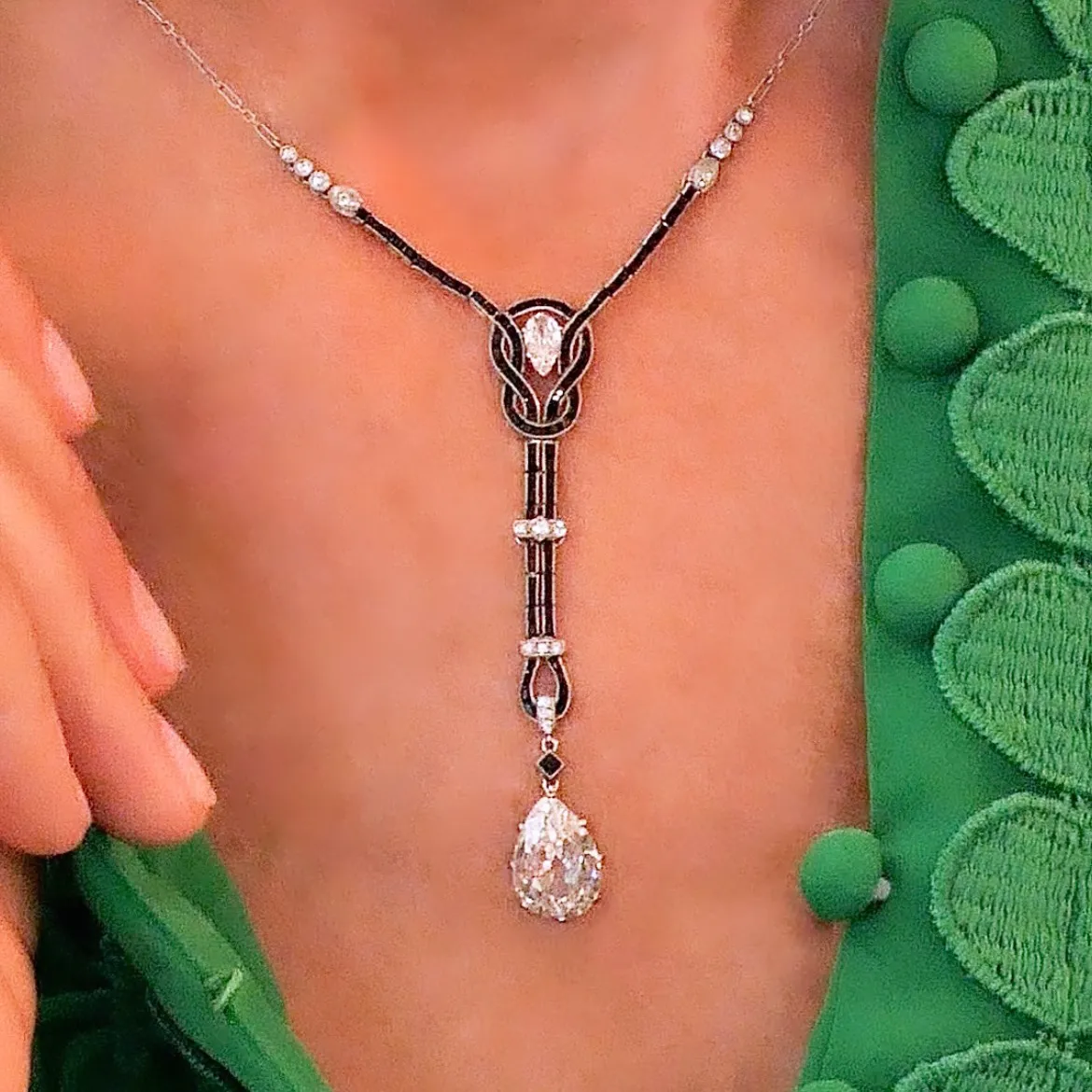 Diamanten ca. 3.00 ct., 1 Diamant ca. 2.50 ct., H vs1, Tropfenschliff 1 Diamant ca. 0.25 ct., G vs2, Tropfenschliff, 17 Altschliffdiamanten in Millegrain Fassung, total ca. 0.50 ct. kalibrierte Onyx Baguette-Linie, als Kordel mit Knotenmotiv, Kette und Fassungen Platin, französische Punzierung Länge Anhänger Oberseite Knoten bis Unterseite Tropfen 6,5 cm, Länge Kette 36,5 cm, 8.6g Boucheron zugeschrieben 2 Boucheron Etuis auf Mass Zertifikat -> mehr über Boucheron